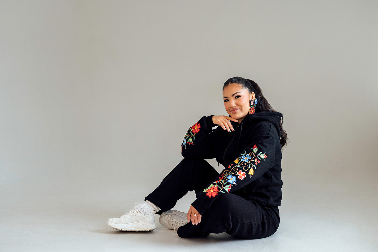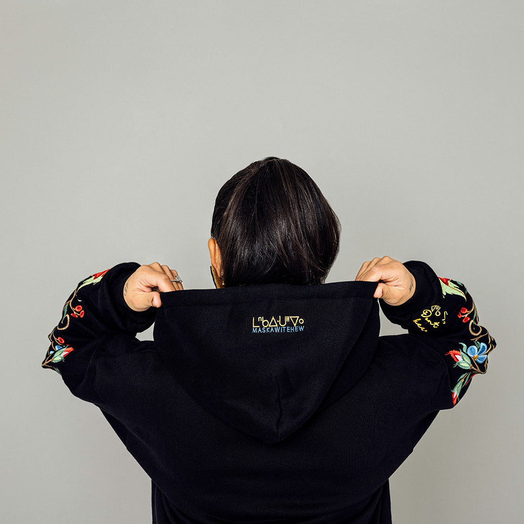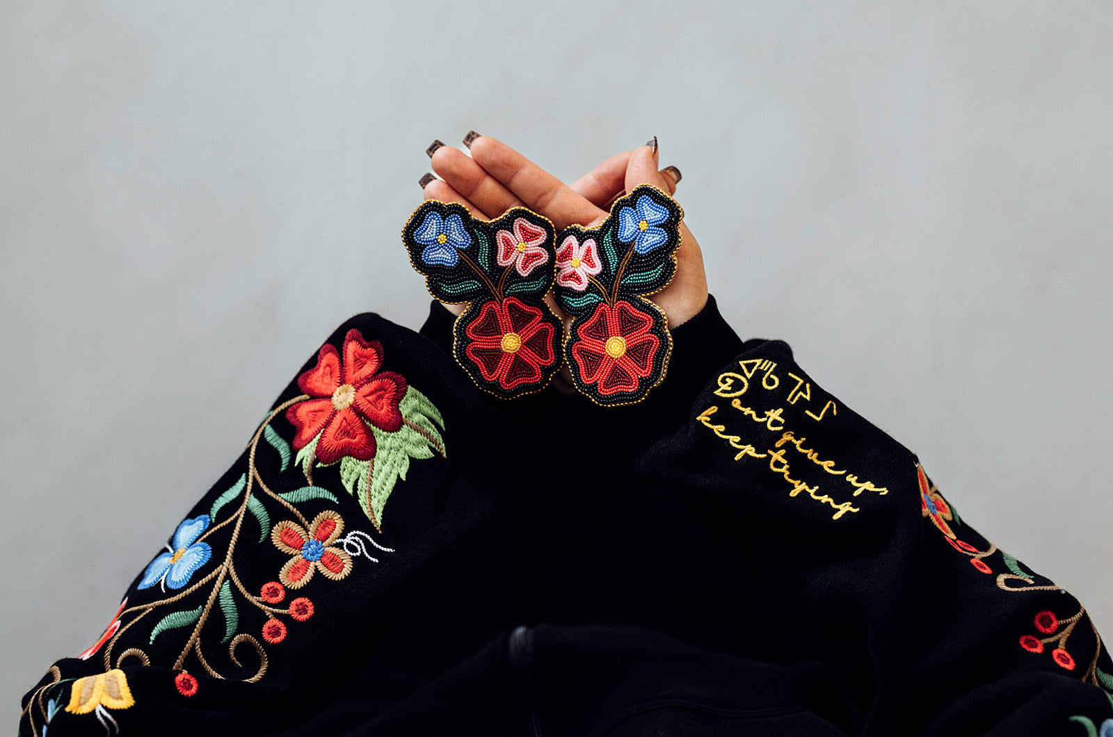 Inside the sleeve, the Cree syllabics read âhkamêyimok — don’t give up, keep trying.